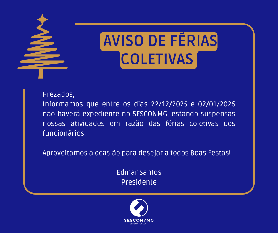 Informamos que, no período de 22/12/2025 a 02/01/2026, não haverá expediente no SESCONMG, estando suspensas as atividades em razão das férias coletivas dos funcionários.
