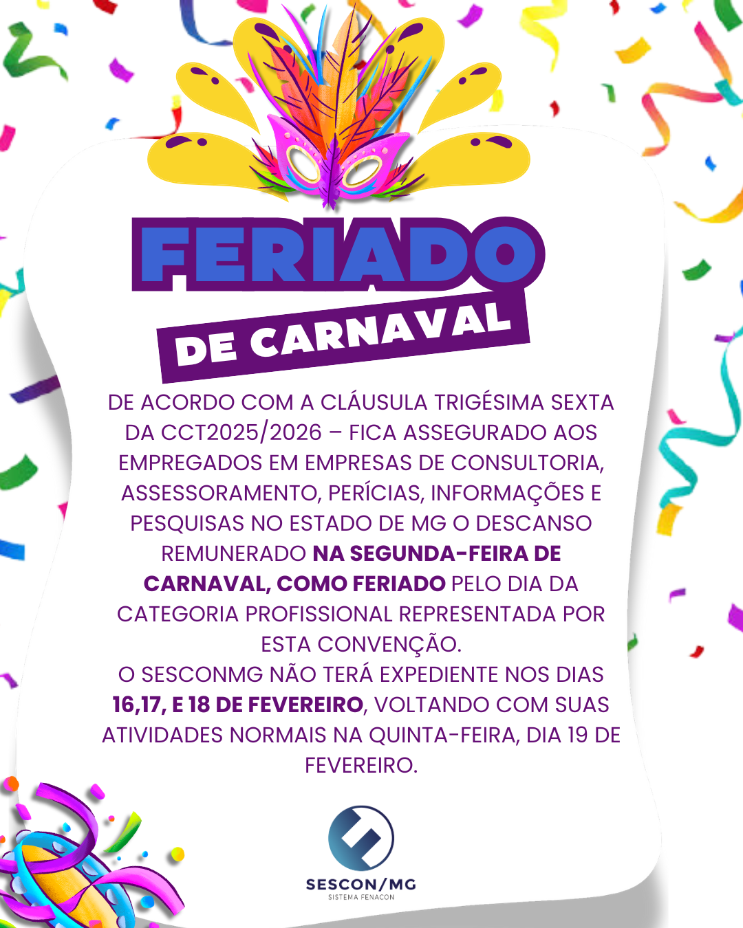 DE ACORDO COM A CLÁUSULA TRIGÉSIMA SEXTA DA CONVENÇÃO COLETIVA DE TRABALHO 2025/2026 – FICA ASSEGURADO AOS EMPREGADOS EM EMPRESAS DE CONSULTORIA, ASSESSORAMENTO, PERÍCIAS, INFORMAÇÕES E PESQUISAS NO ESTADO DE MG O DESCANSO REMUNERADO NA SEGUNDA-FEIRA DE CARNAVAL, COMO FERIADO PELO DIA DA CATEGORIA PROFISSIONAL REPRESENTADA POR ESTA CONVENÇÃO.