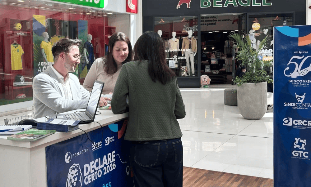 SESCON Serra Gaúcha: realizou ação no Shopping Villagio Caxias, orientando contribuintes para uma declaração mais segura e sem inconsistências.